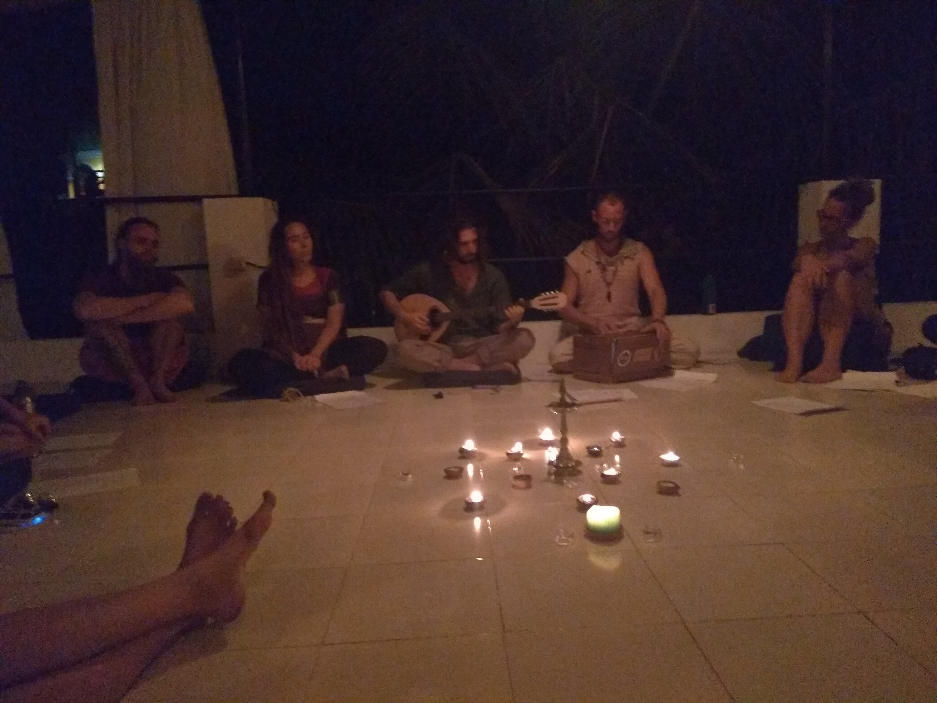 Závěr dne byl věnovaný meditacím, které většinou vedl Manjeet. Provedl nás mnoha druhy meditací. Kromě tzv. jóga nidry (hluboké hodinové relaxaci vleže na zádech), trátaku (koncentraci na plamen svíčky) jsme si vyzkoušeli i spoustu aktivních forem meditace. Meditaci chůzí, třesením celého těla či tancem. Často večerní meditace navazovala na hodinu filozofie a byla například zaměřena na jednu z čaker. Koncem třetího týdne nás Manjeet připravoval i na závěrečnou zkoušku z meditací, kdy jsme si postupně zkoušeli vést krátké úseky meditací.