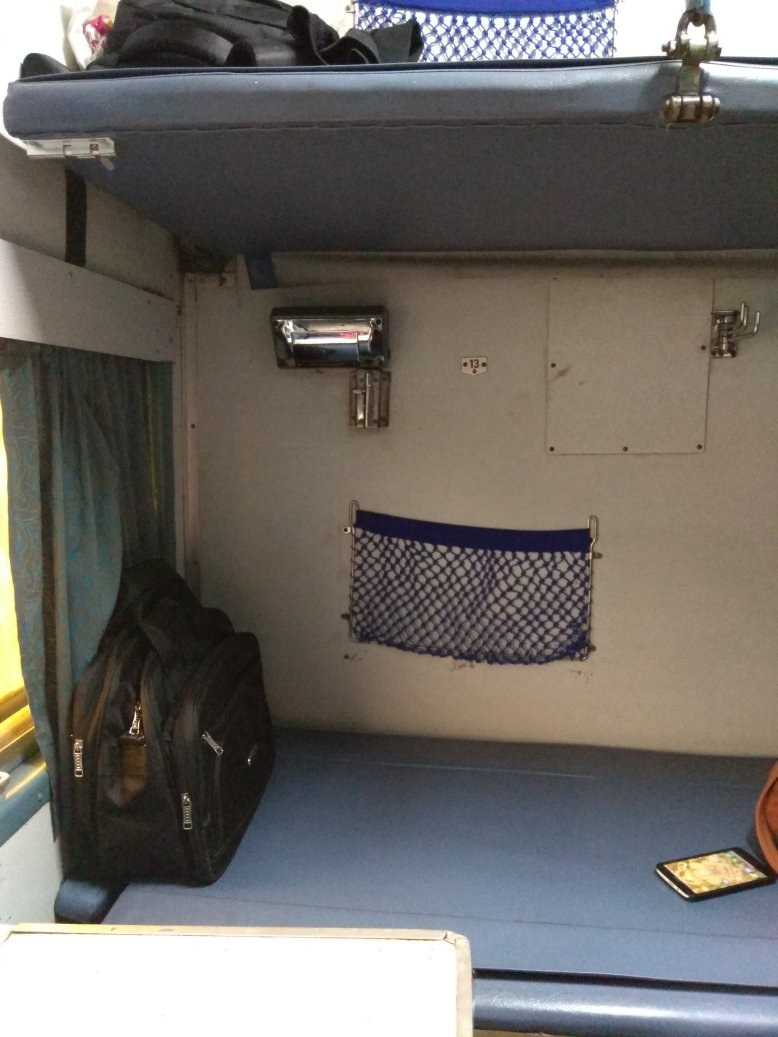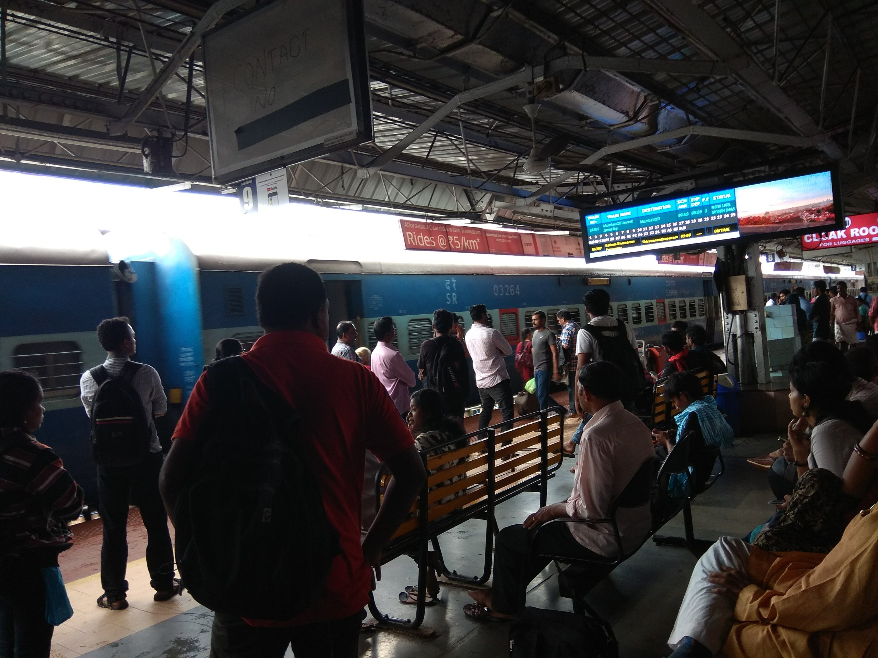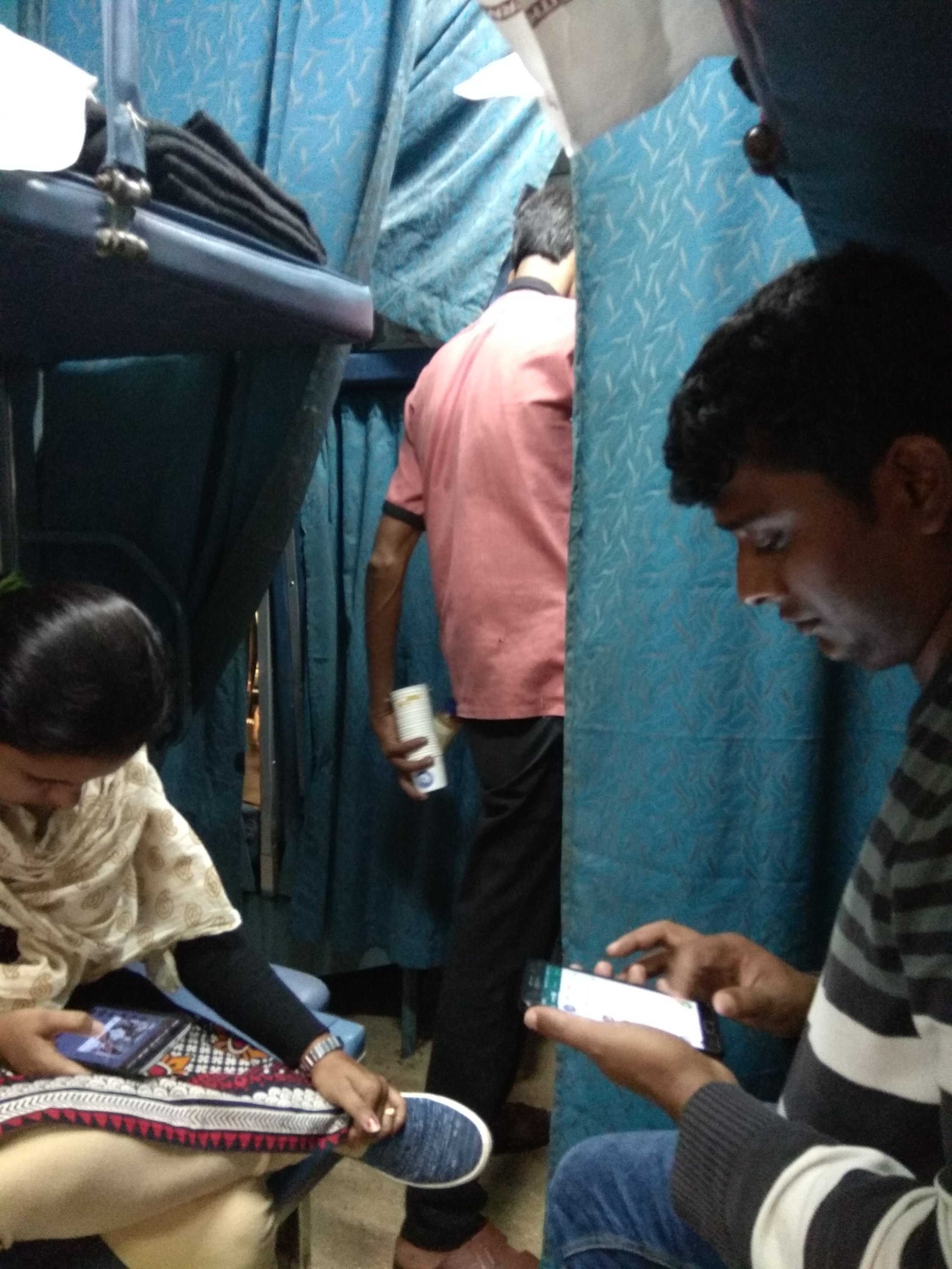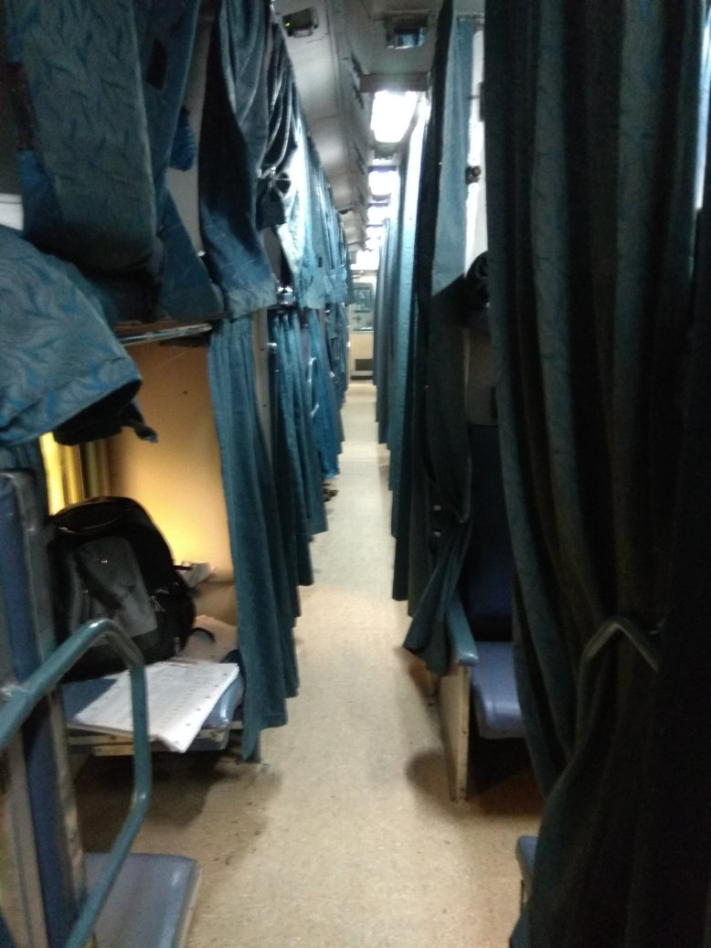 První jízda vlakem v Indii byla celkem pohodová. Jen na nádraží v Trivandrumu byly zmatky s odjezdem vlaku, protože kvůli následkům tropické bouře vlak postupně nabíral zpoždění. Ale to vám nikdo neřekne, jen se prostě čeká. Až pak konečně přijel dlouhatánský vlak. Já jsem měla koupené místo v druhé třídě, kde je vagón rozdělený modrými záclonami na jednotlivé kupé. Uvnitř jsou nad sebou dvě a dvě místa na sezení či ležení. Dohromady tedy takové čtyři tvrdší postele.