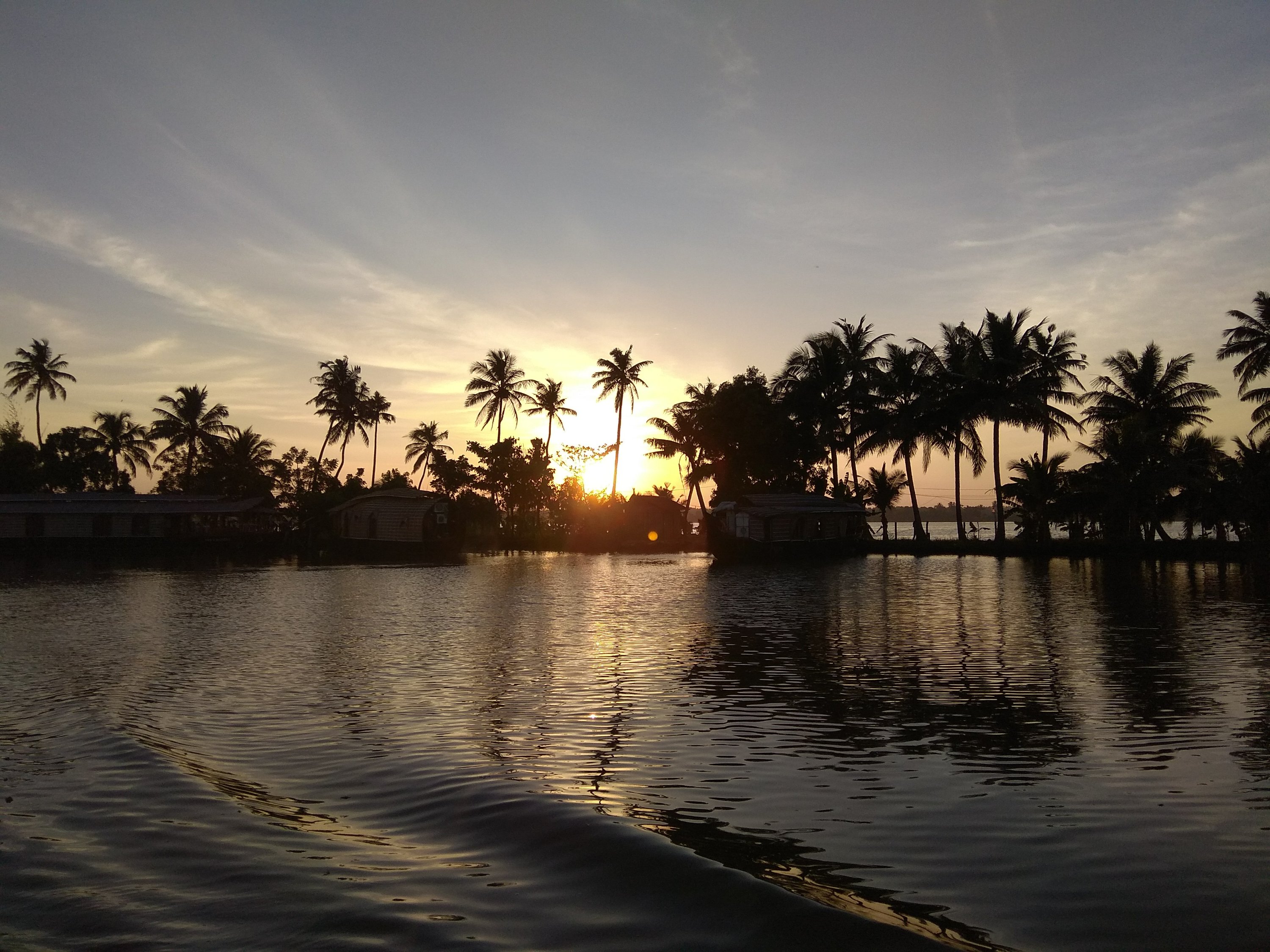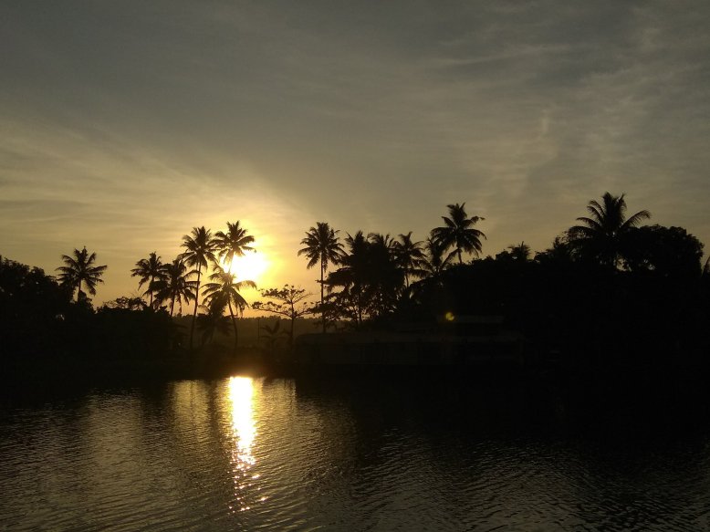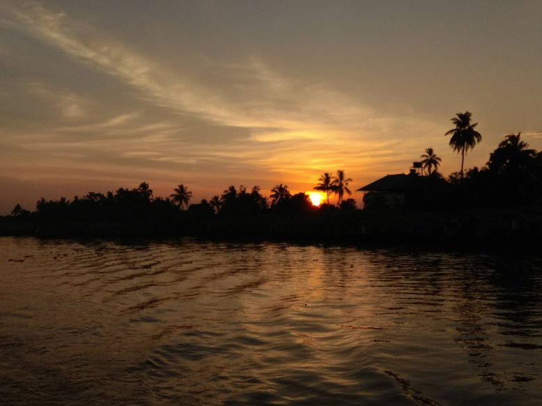 Až v podvečer jsem opět zase chvíli pozorovala konec cesty z venku z lodi. Jak jsme se přibližovali k Alleppey, začaly se po cestě čím dál tím častěji objevovat krásné dřevěno-proutěné houseboaty. A s tím zapadajícím sluncem to zas vydalo na pár krásně kýčovitých fotek 🙂