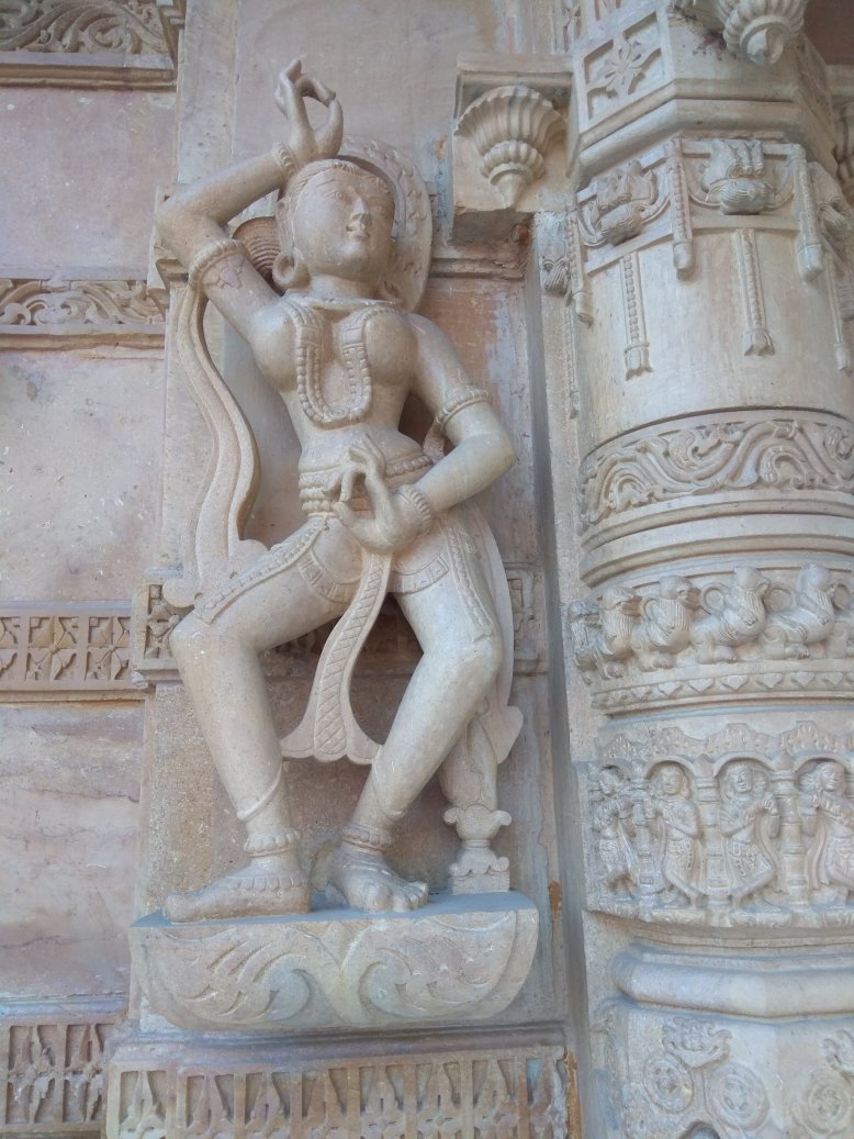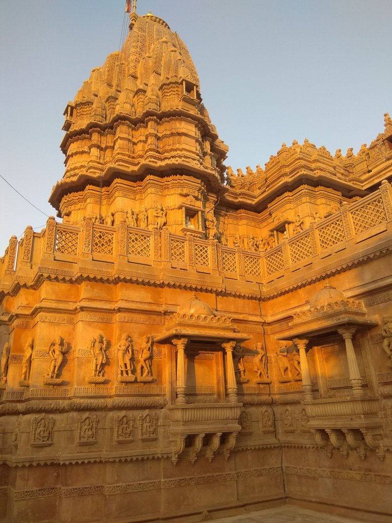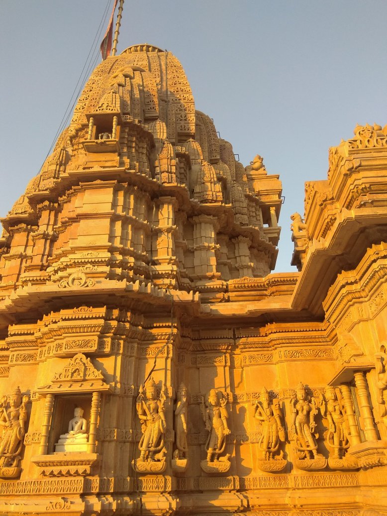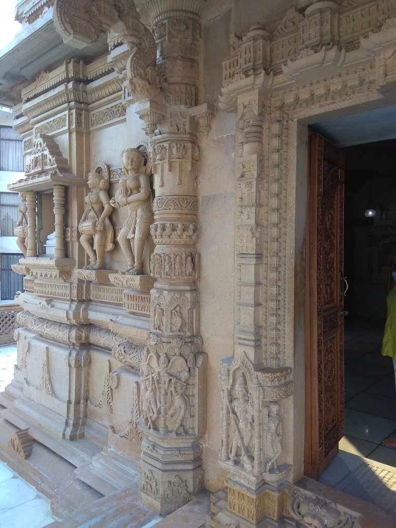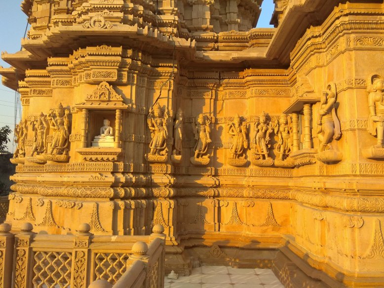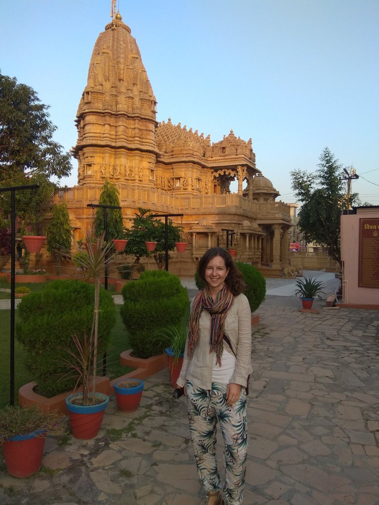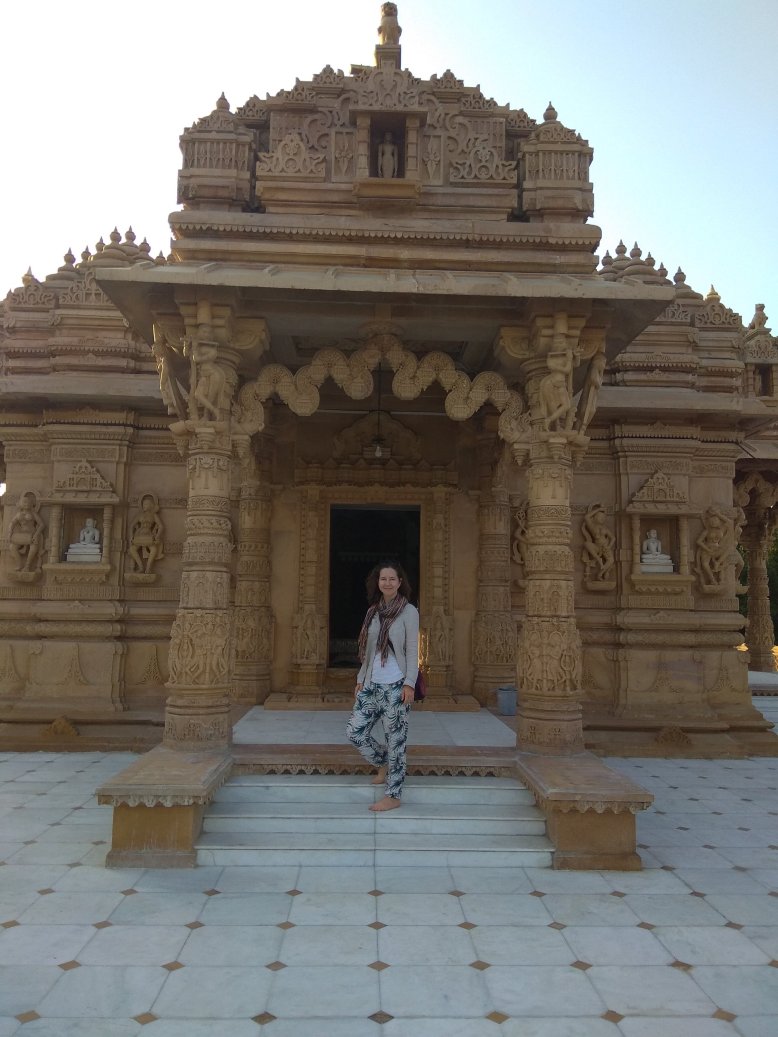 Cestou jsme se stavili v místním džinistickém chrámu. Jedna z našich spolužaček z Bombaje, která jela s námi, je tohoto náboženství. Přišla se pomodlit. My ostatní ji následujeme a nemůžeme se vynadívat. Chrám je doslova celý vytesaný z kamene. Zvenku i zevnitř neskutečně detailní dekorativní práce – postavy, ornamenty… Jako jedna socha přecházející do druhé. Jsme tu úplně sami, slunce začíná zapadat a barva kamene je ještě hřejivější. Nikomu z nás se myslím z té poklidné atmosféry nechce odcházet. Musíme ale už ke Ganze, najít si dobré místo na břehu před začátkem slavnosti.